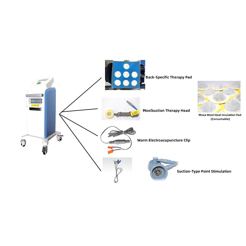 | Main functions of the equipment | Mokeless warm moxibustion, magnetic therapy, warm acupuncture, electro-acupuncture, warm electro-acupuncture, non-invasive electro-acupuncture, and negative pressure cupping. |