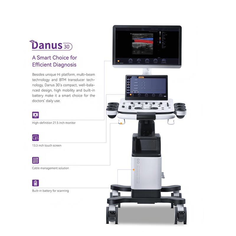 Ultrasound Machine is a Smart Choice for Efficient Diagnosis.Besides unique Hi platform,multi-beam technology and BTM transducer tech-nology, Danus 30's compact,well-bala- nced design,high mobility and built-in battery make it a smart choice for the doctors'daily use.
